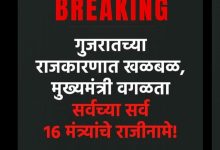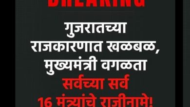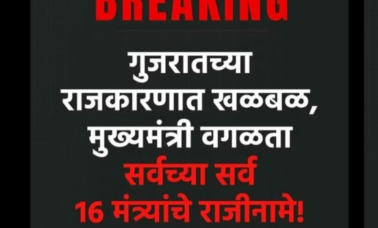 ब्रेकिंग न्यूज गुजरात सरकार मध्ये राजकीय भूकंप मुख्यमंत्री सोडून सर्वच्या सर्वच्या सर्व मंत्र्यांचा राजीनामा